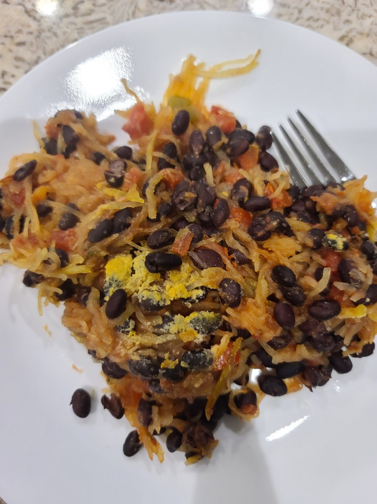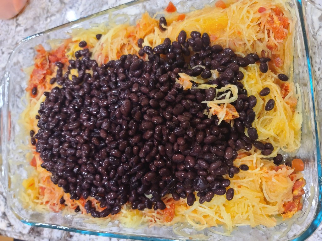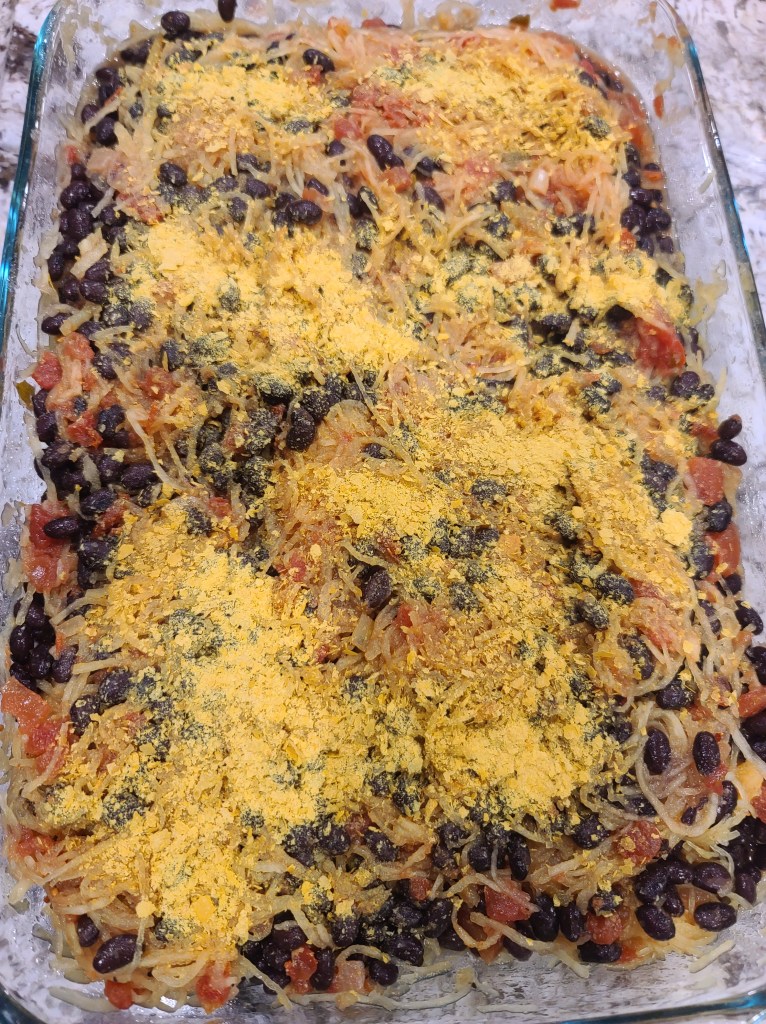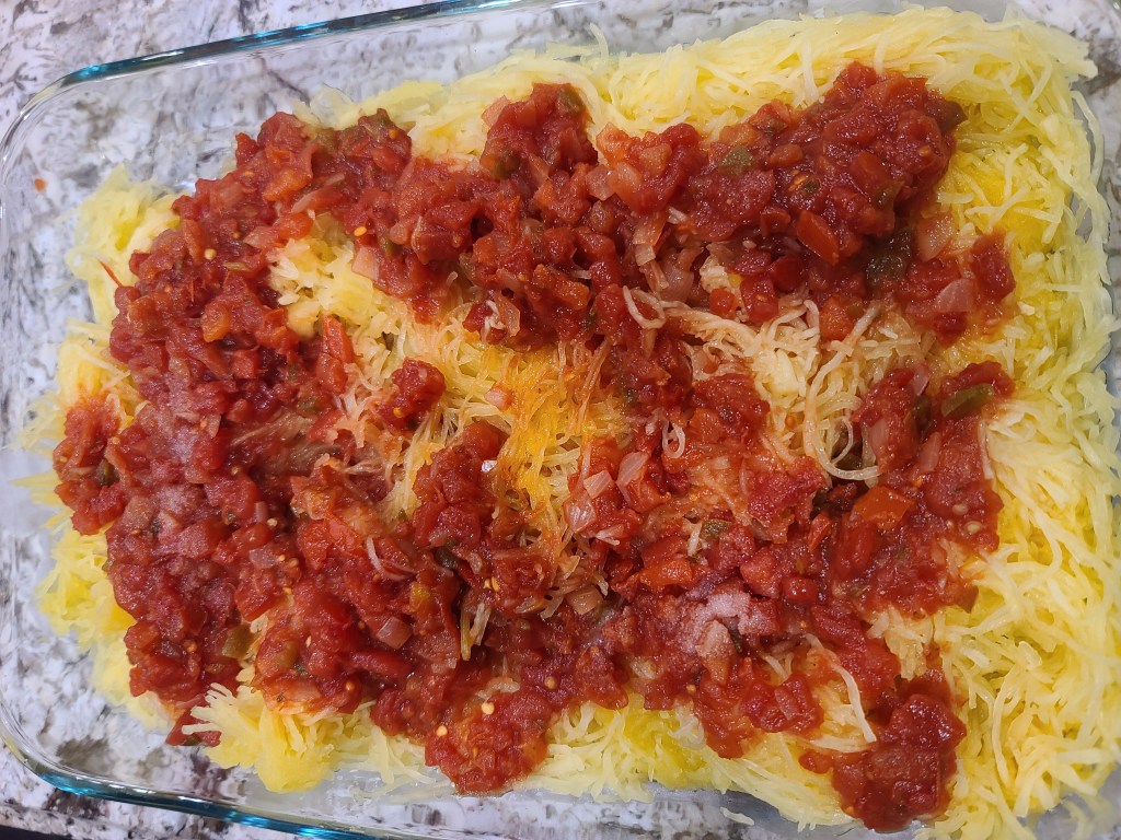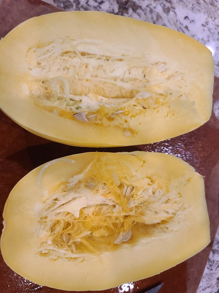 - 2 Medium sized spaghetti squash (cooked in the microwave or baked – strands removed)