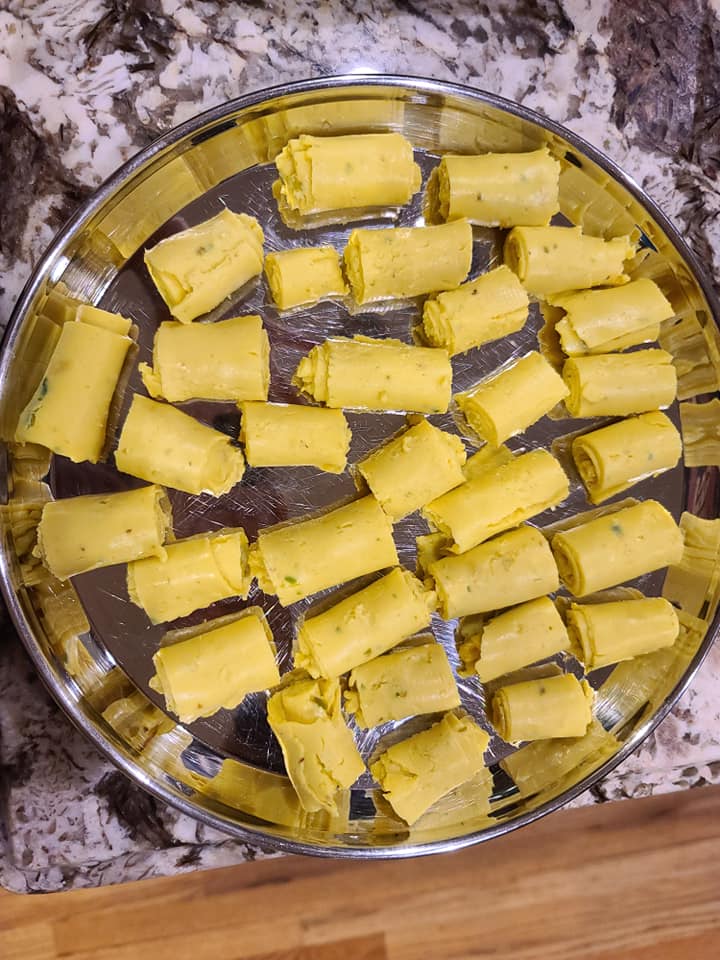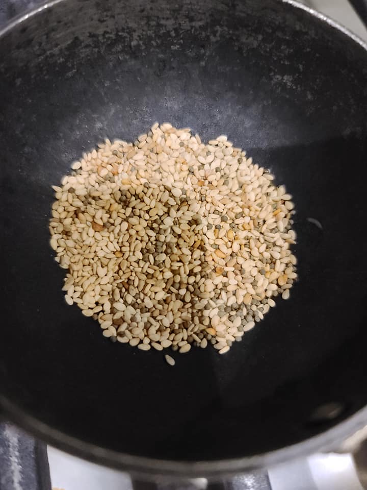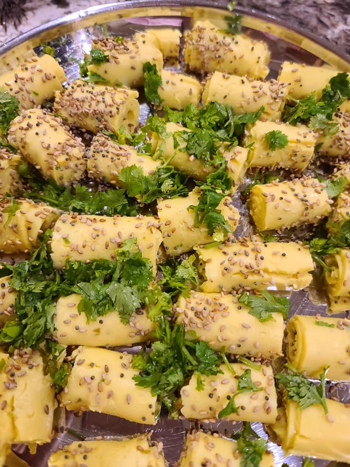- Dry tempering is mustard seeds, sesame seeds – spread it all over the Khandvi rolls