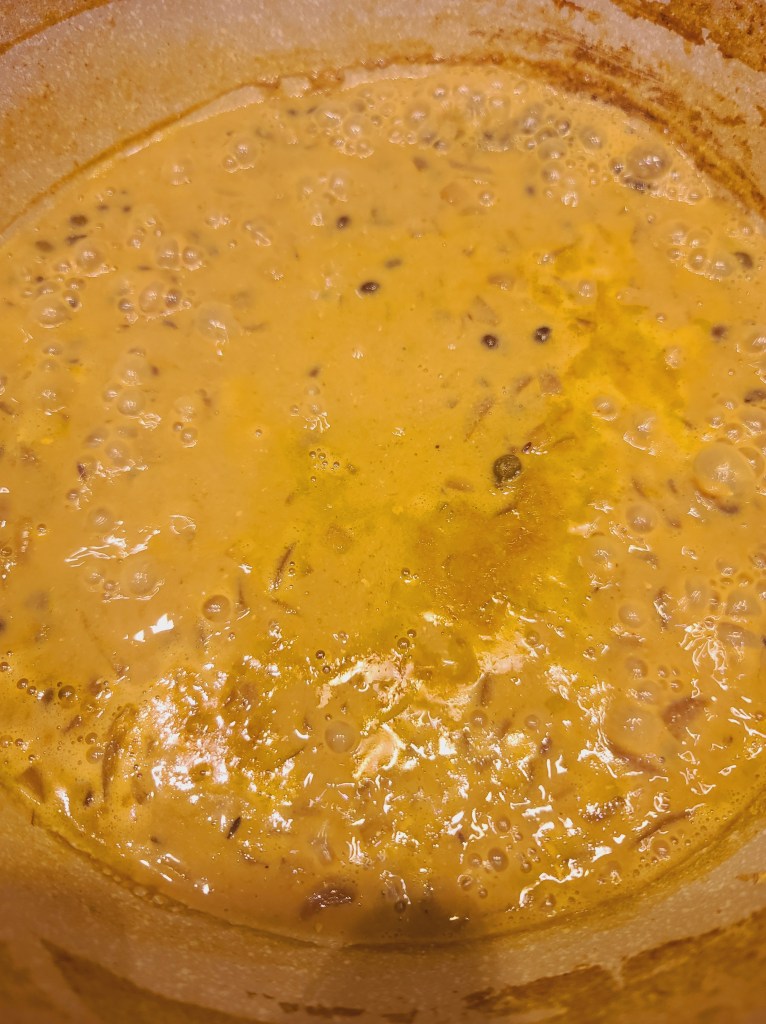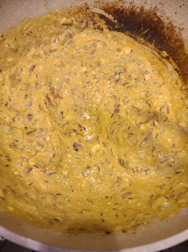 - Add beaten yogurt, spices, water and cook on a low flame for another 3-5 mins