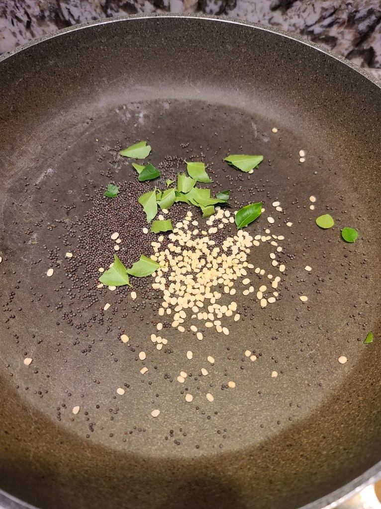 - For tempering – Mustard seeds, spilt urad dhal, Curry leaves