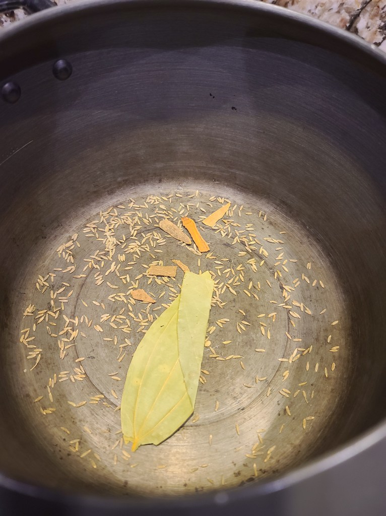 - In a pressure cooker dry roast cumin seeds, bay leaf, cinnamon stick