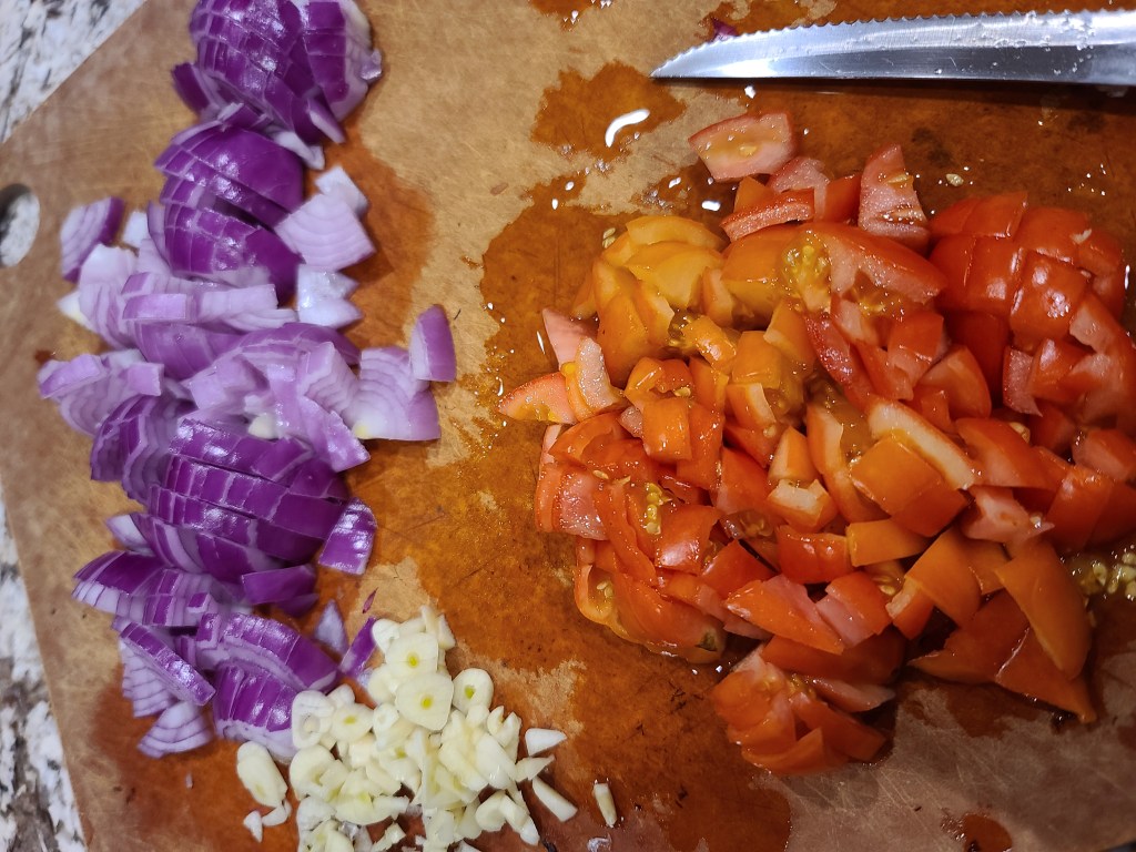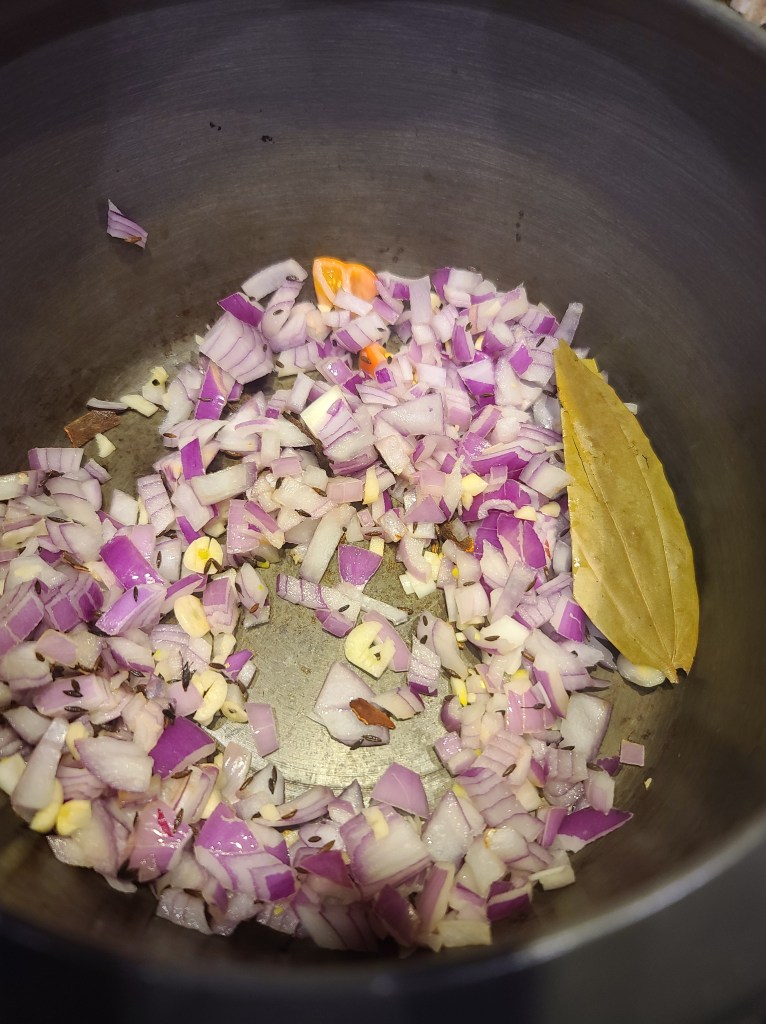 - Then add chopped onion and garlic and saute for 3-5 mins. Add a pinch of salt for the onion to release some moisture.