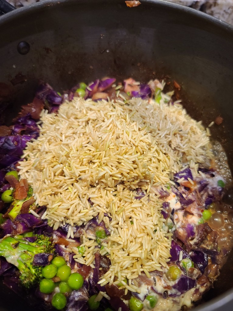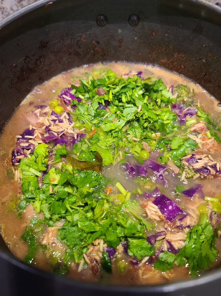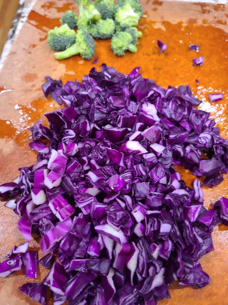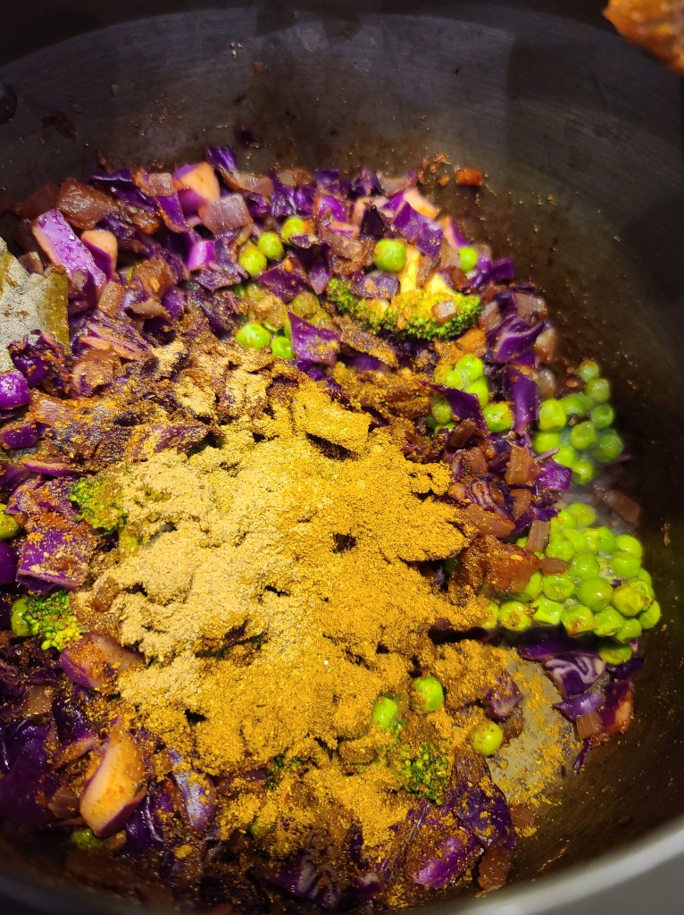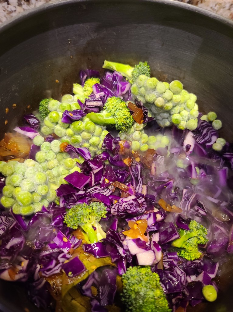 - Next add purple cabbage, green peas, broccoli, and the spices and saute it for 3-5 mins