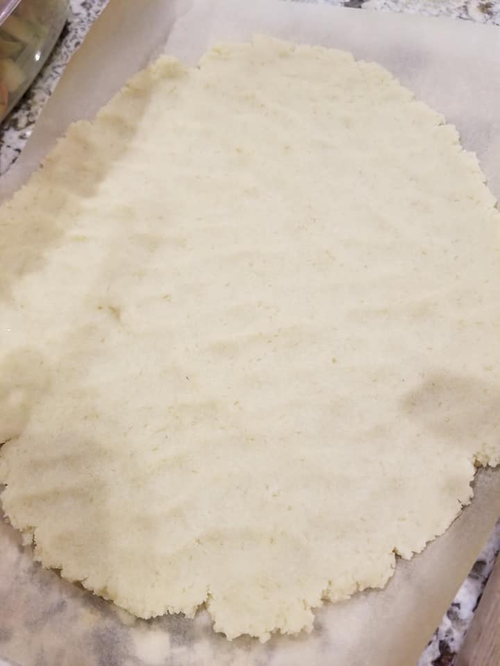 - Then on parchment paper roll it out…I used my fingers and tapped to roll it out