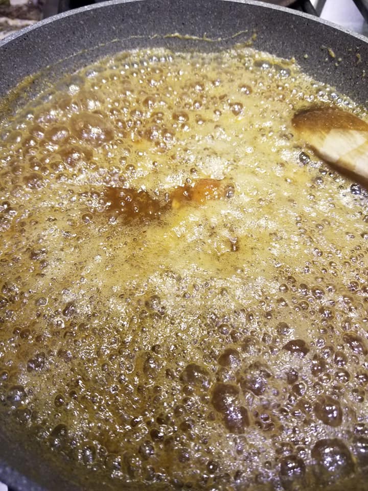 - Once the sugar melts add the date puree, maple syrup and keep stirring till the raw smell of the date goes away (add 1/2-1 cup of water if needed).