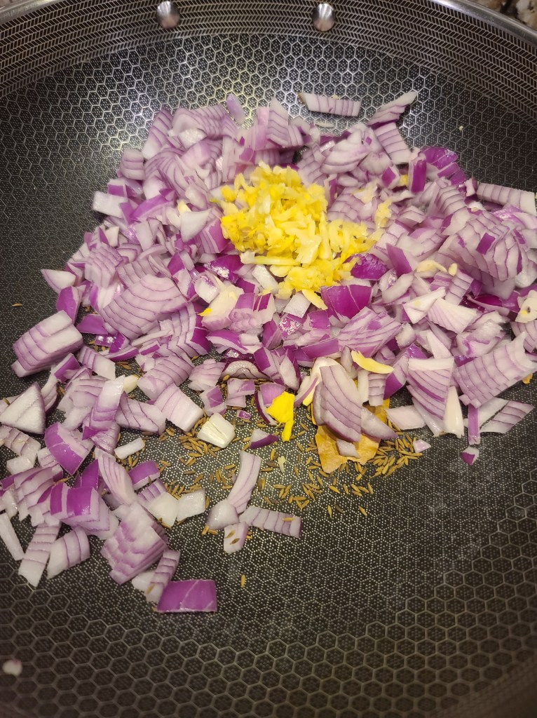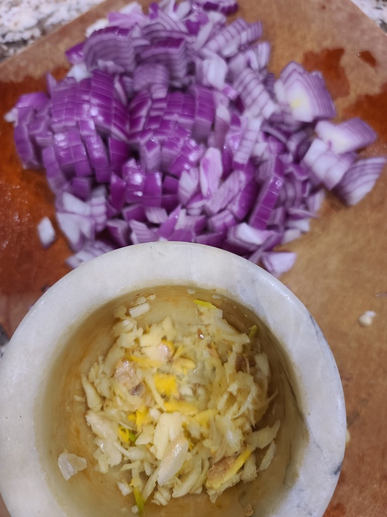 - Then add chopped onions, crushed ginger-garlic. Saute it for 4-5 mins