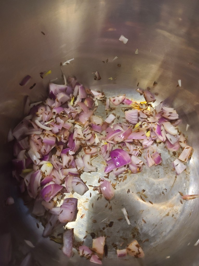 - In the instant pot, in the saute mode dry roast the cumin seeds, then add onion, Hing and saute for 4-5 mins. Add a tsp of water at a time to ensure the onion does not get burnt