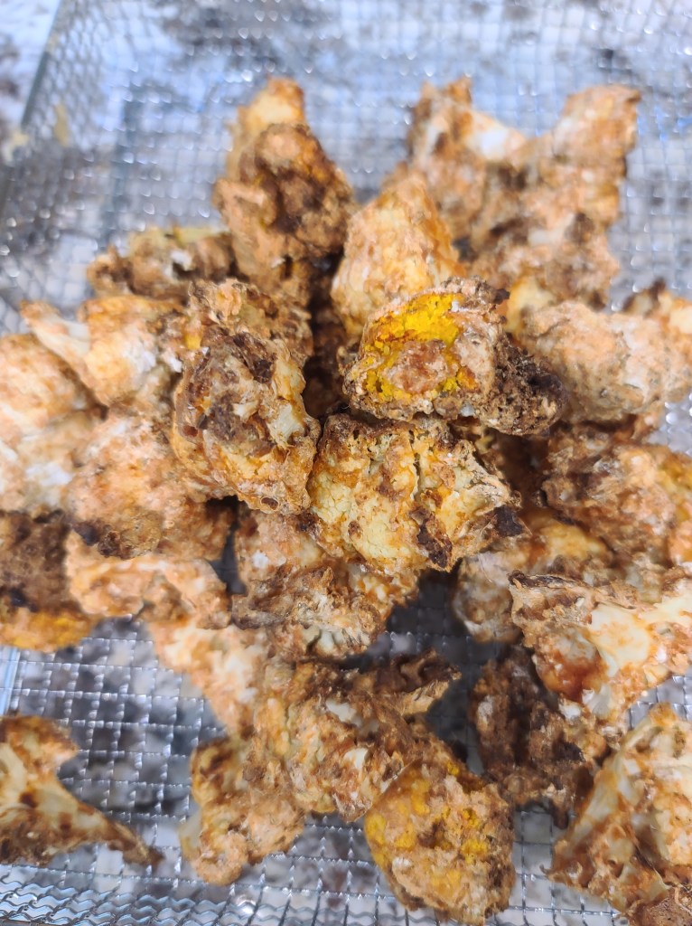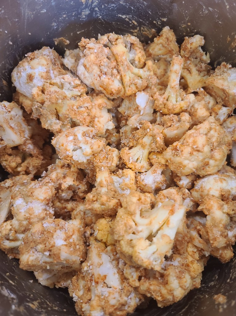 - Drain out all the water. Transfer to a mixing bowl – add the starch, wheat flour, ginger-garlic paste, kashmiri chili powder, chilli powder, 1-2 tbsp of soy sauce. Mix everything till the cauliflower is well coated. Air fry for 5-9 mins at 350F. toss it around after 4-5 mins and then air fry again.