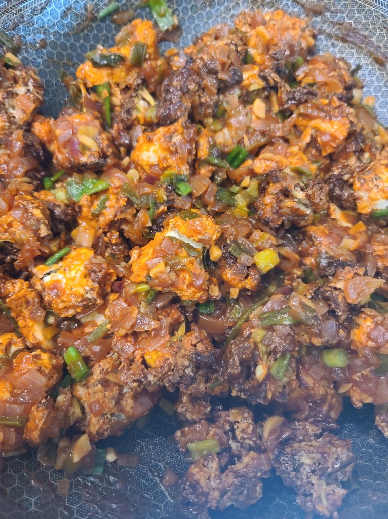 - Just before serving add the air fried cauliflower, green portion of spring onion.