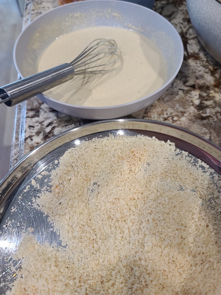 - In a separate bowl – mix the breadcrumbs, salt, chilli powder, garlic powder