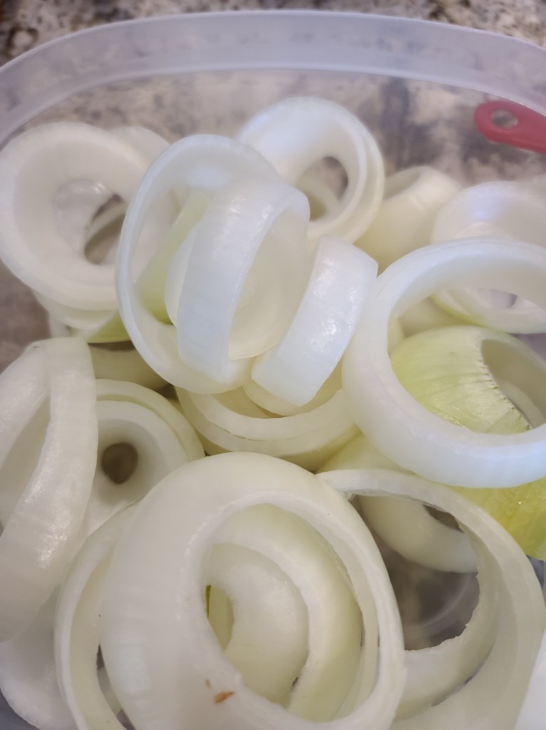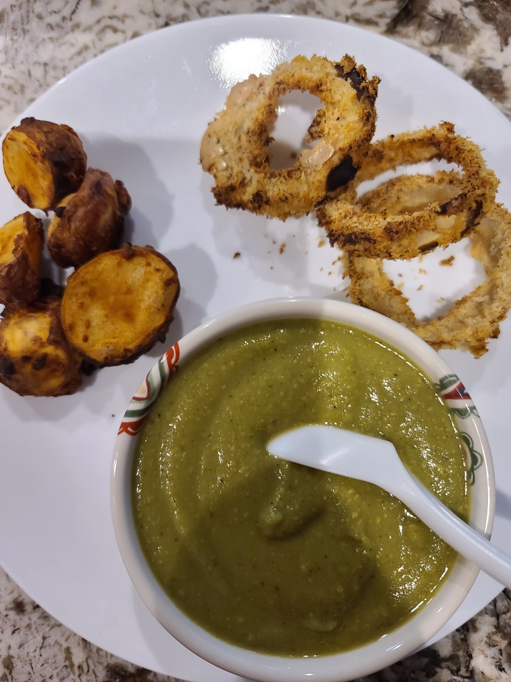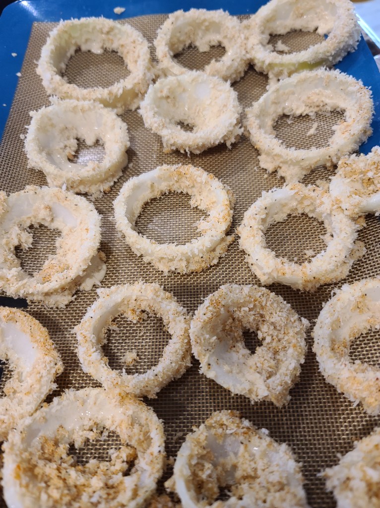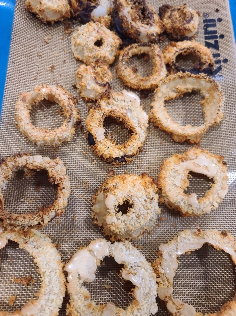 - Now take each individual slice of the onion, dip in the oat batter, then coat it with breadcrumbs.