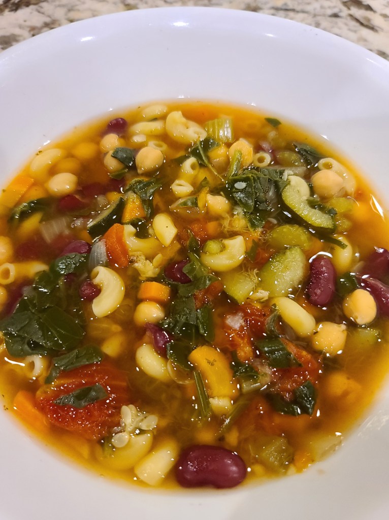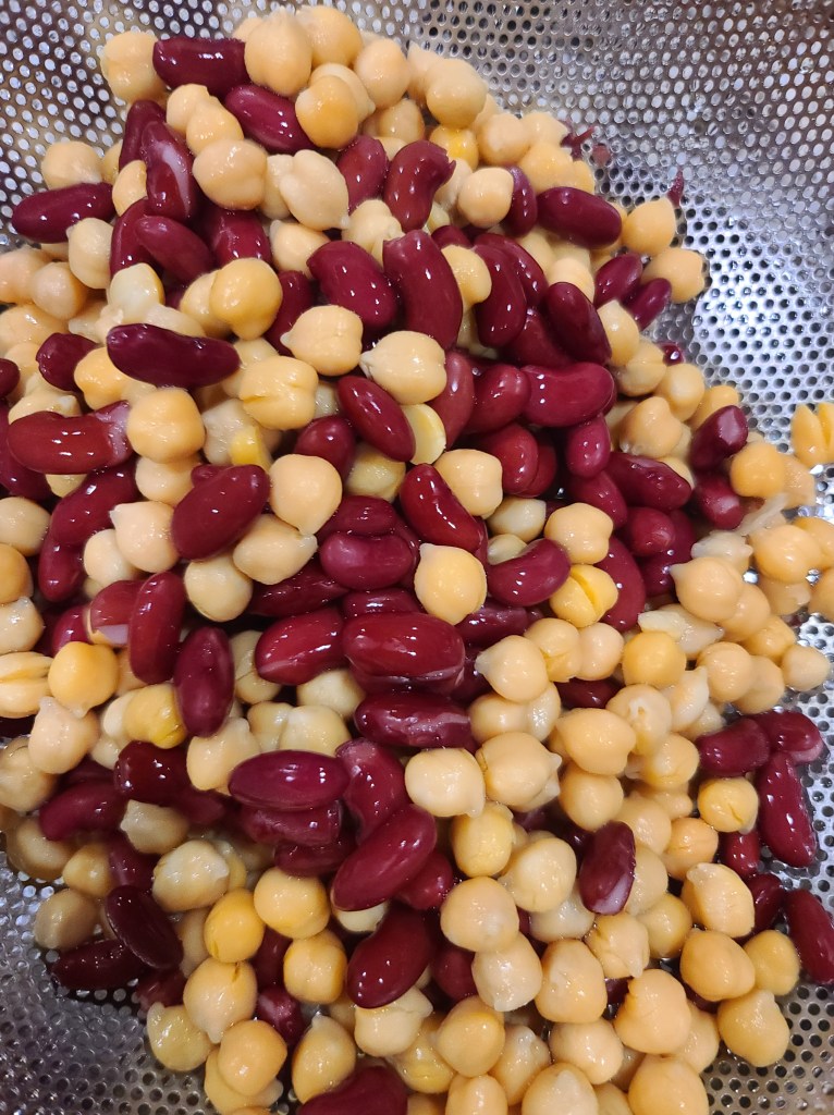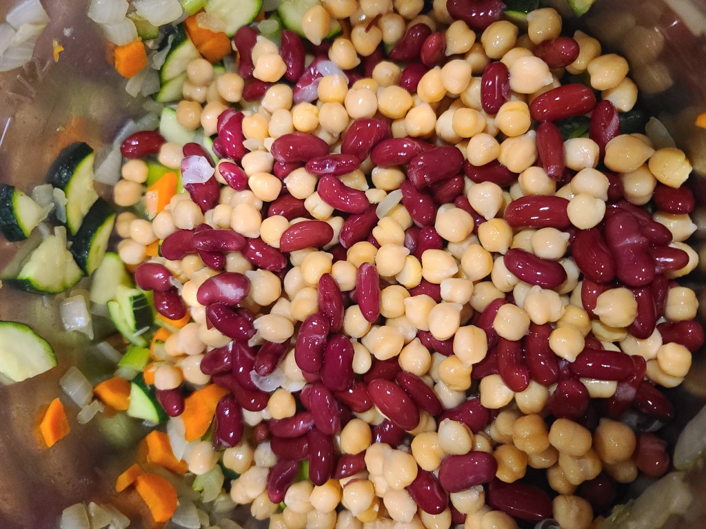 - Add kidney beans, garbanzo beans, diced tomatoes, spices, vegetable stock, add additional water if needed.