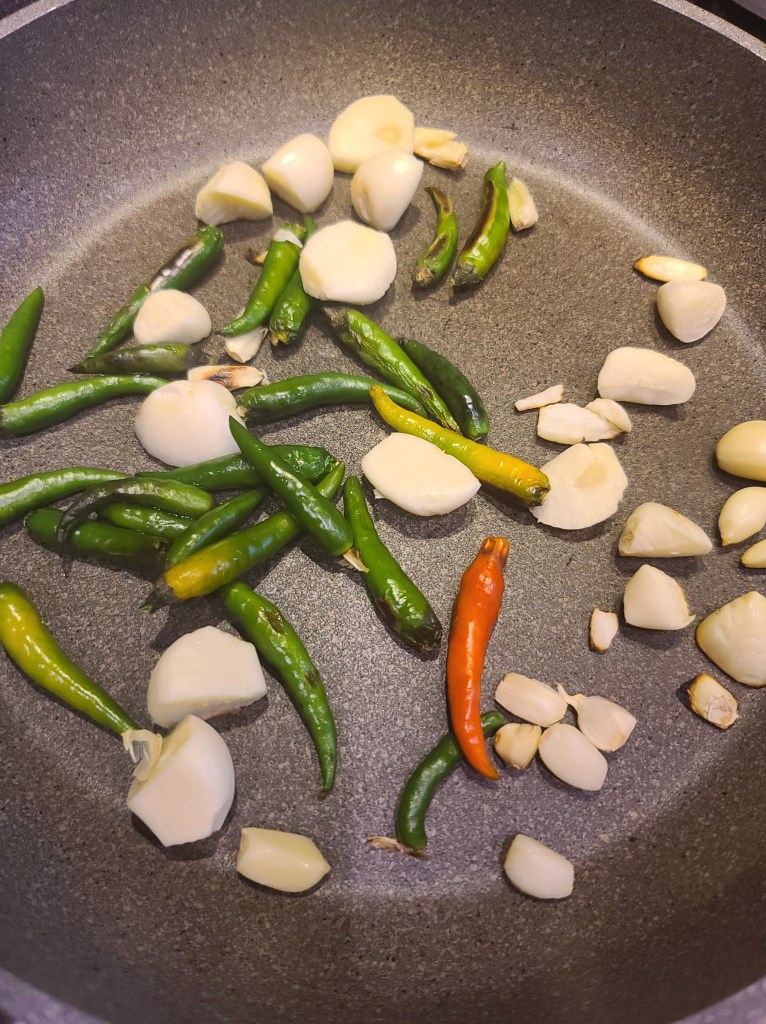 - Then transfer all the ingredients including roasted garlic and green chillies to a mortar/pestle