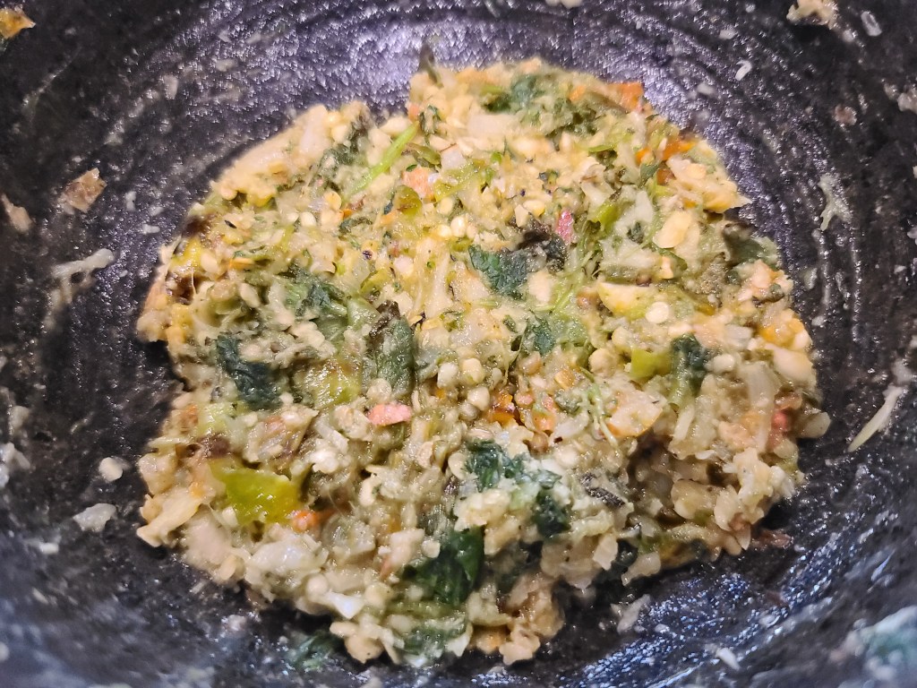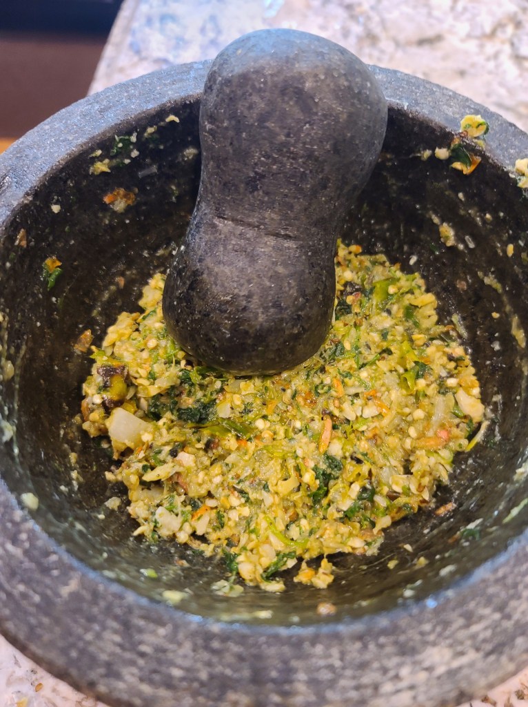 - Keep pounding the ingredients till you get a coarsely ground paste