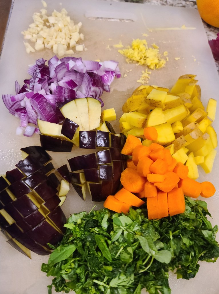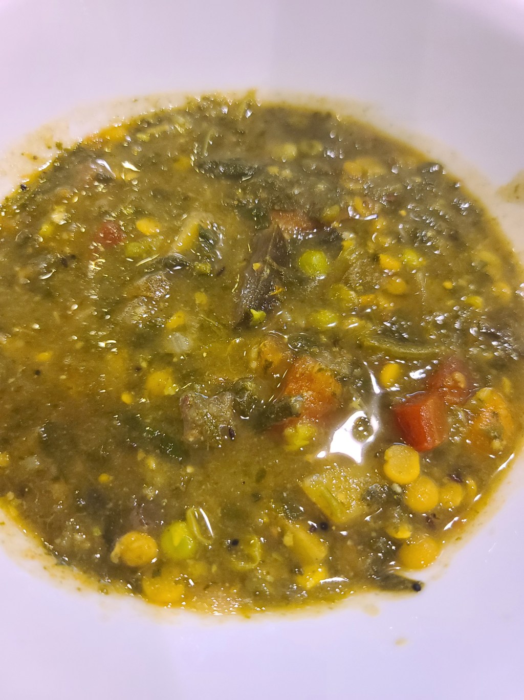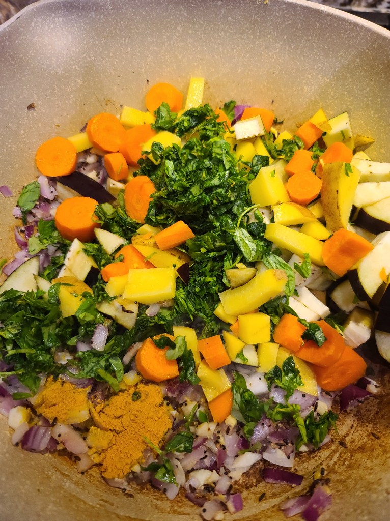 - Add the rest of the veggies, channa dal except spinach and saute for 3-4 minutes