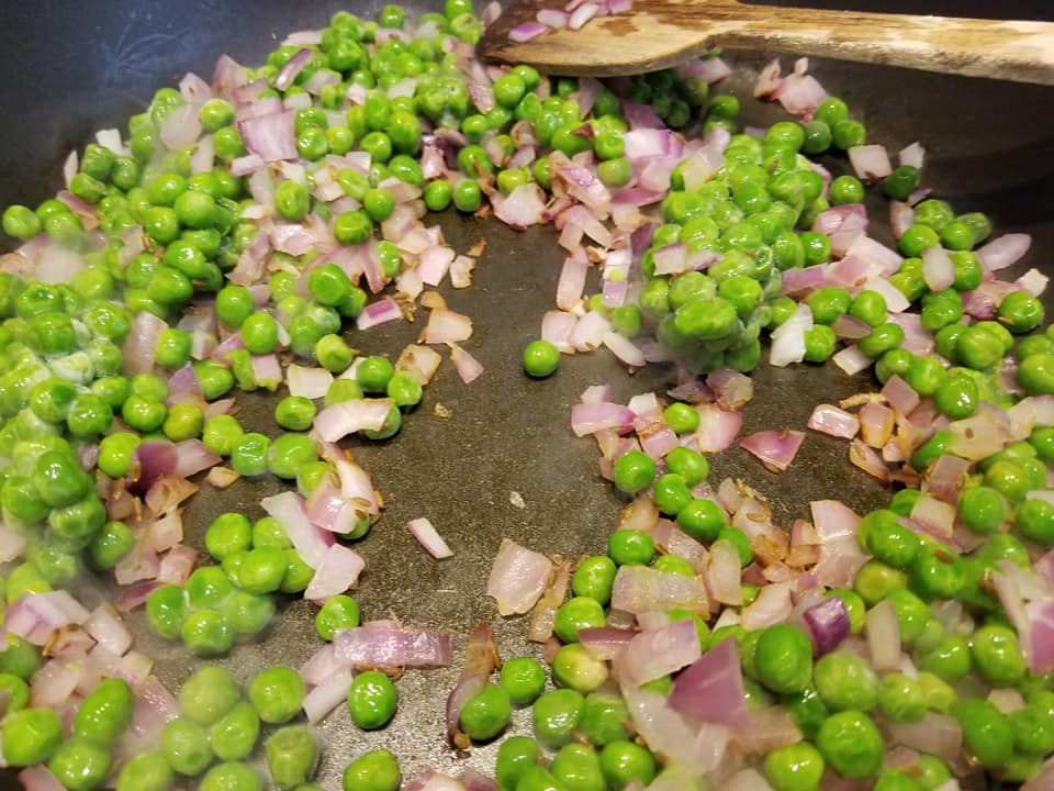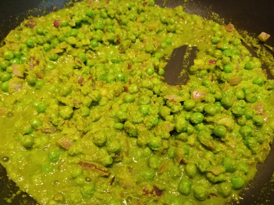 - Then add green peas, potatoes, cilantro puree, add 1/2 cup of water and let it simmer for 4-5 minutes
