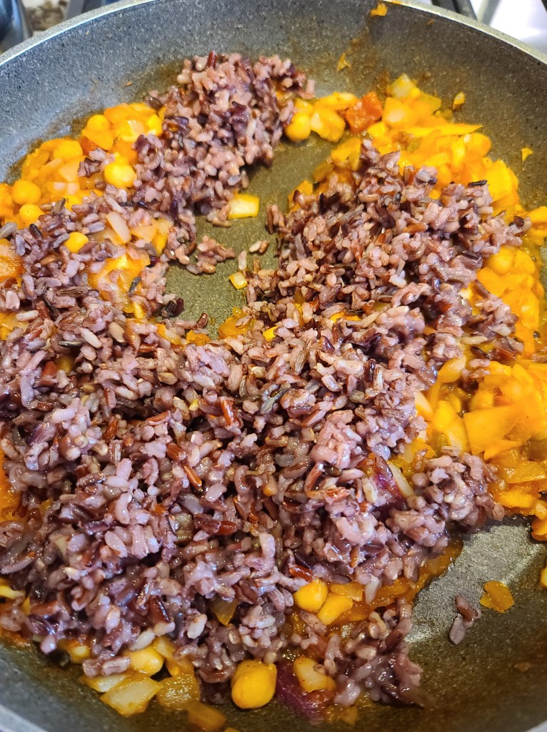 - Then add rice, rest of the spices and chopped cilantro. Cook for another couple of mins or so.