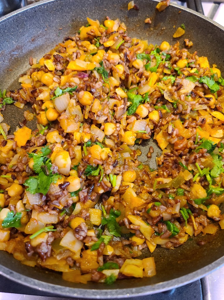- Then add the sweet potatoes, garbanzo beans and salsa, cook for another 3-4 mins